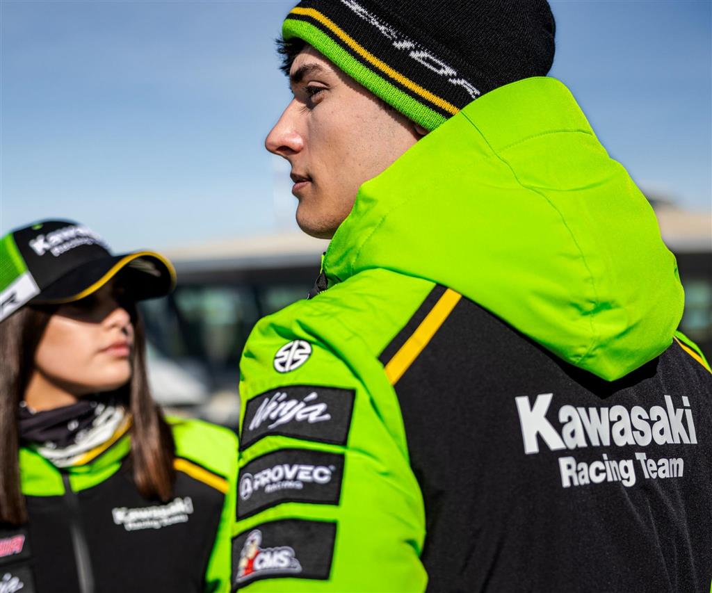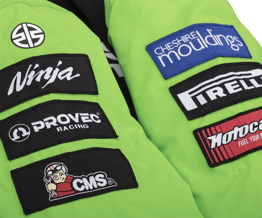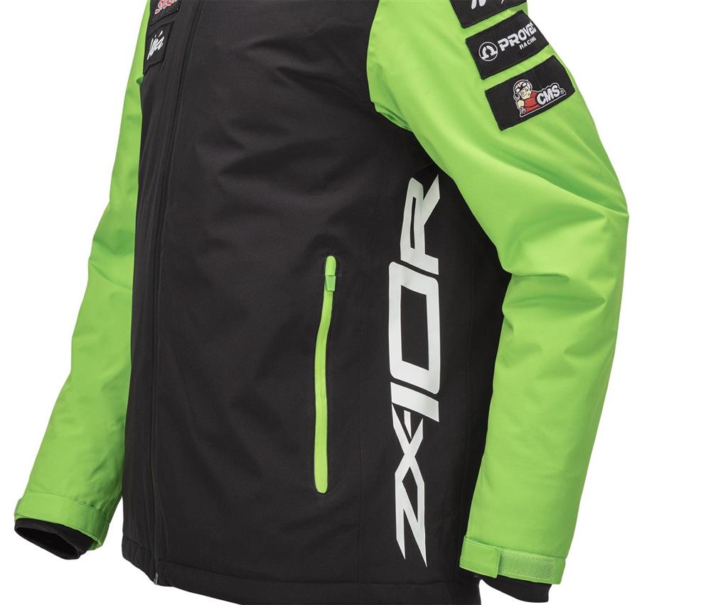 Padded waterresistant jacket in Kawasaki WSBK 2024 team-colours. It has zipped inner and outer pockets and internal sleeve cuffs.
